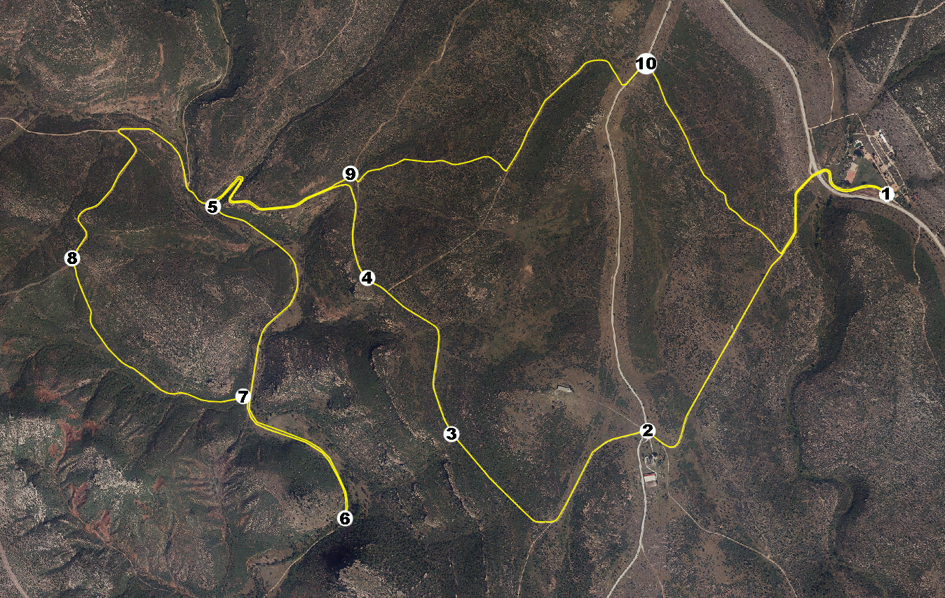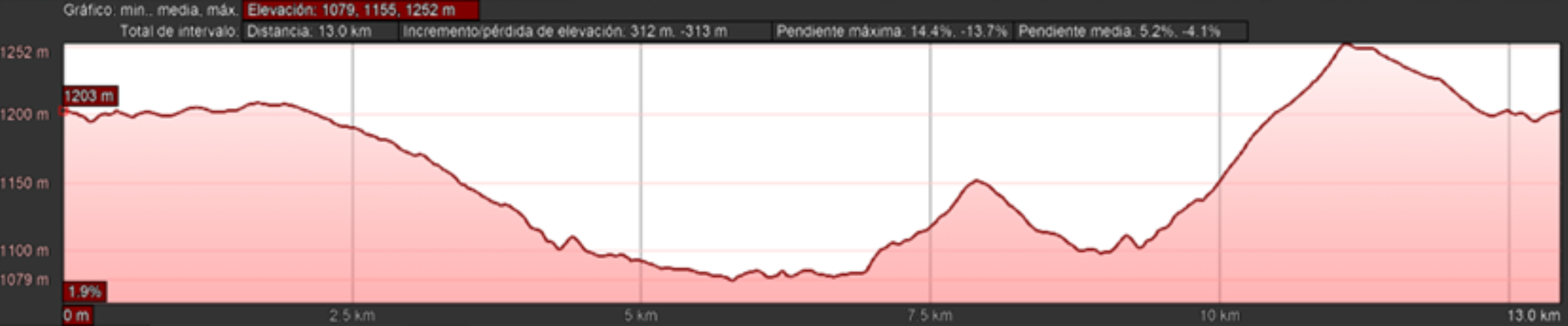 Tiene una longitud de 13 km con un desnivel acumulado de 315 m y su dificultad es media-baja. La primara mitad es en descenso, y la segunda mitad es algo más dura, alternando subidas y bajadas, con dos tramos, de 1 y 1,5 km de intenso ascenso, para poner a punto las piernas y la forma física. Existe la posibilidad de reducir la distancia a 7 km mediante un sub-circuito, conectando el punto 3 con el punto 9.
